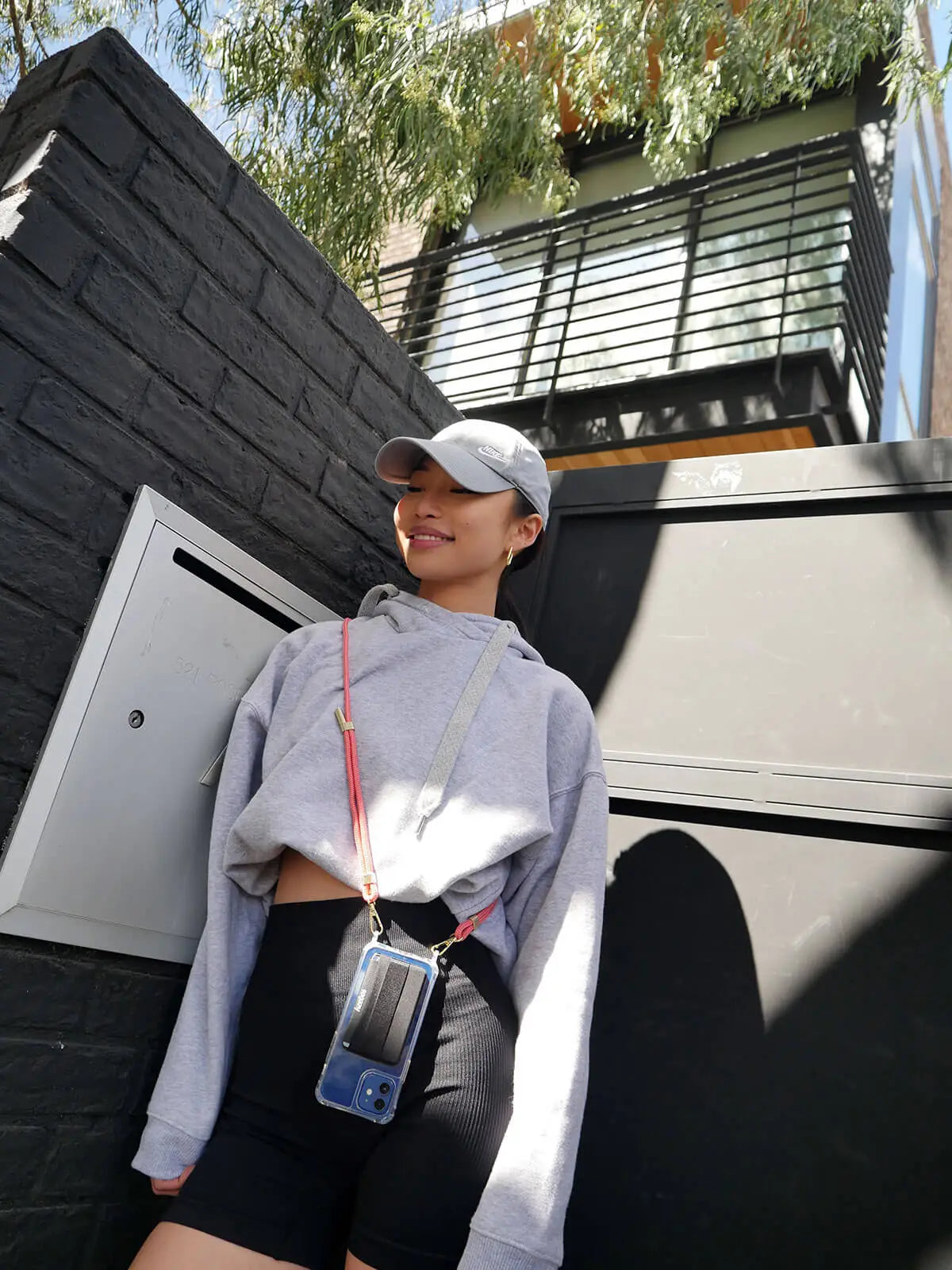 Just place your phone into the slim phone case. Then pull the two ends of the strap to tighten the loop according to your preferred length. There's a slim and super convenient wallet on the back of the case for credit cards, IDs and cash.