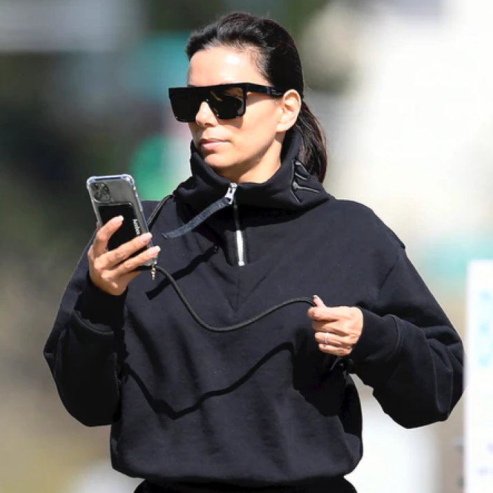 "Her look was topped off with angular sunglasses and she carried her phone via a chic little crossbody sling by Keebos" -Daily Mail
